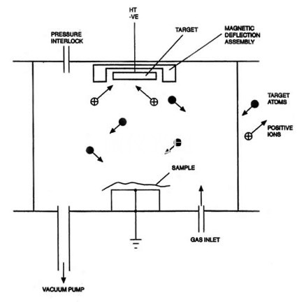 圖 3. 離子濺射儀的原理圖。稀薄氣體被高壓電離,產(chǎn)生正離子,被加速,轟擊靶材,產(chǎn)生原子團(tuán)簇,在樣品表面沉積成膜。
