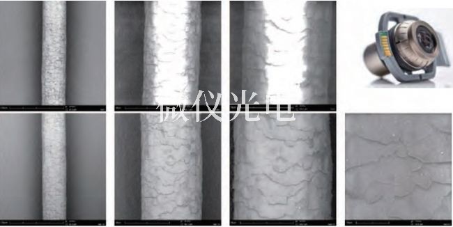 圖 5. 普通模式觀察頭發(fā)(**行);低真空模式觀察頭發(fā)(第二行);降低荷電樣品杯(右上)