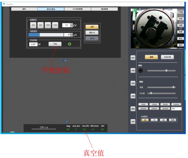 1、啟動(dòng)并放入樣品,將真空抽至0.01并保持至開(kāi)槍按鈕常亮后,然后點(diǎn)擊開(kāi)槍按鈕。