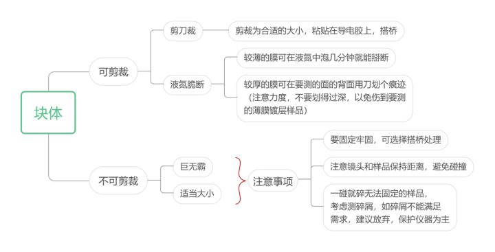1.塊體樣品。直接可以用導(dǎo)電膠粘在樣品臺(tái)上測(cè)試,若需拍塊體或者薄膜截面,需明確截面制備方法,一般可以通過(guò)剪刀裁剪或者液氮脆斷兩種方式來(lái)制備樣品。